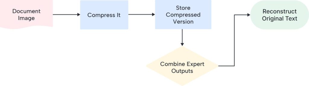 Once the document is compressed into this tiny package, a second system reads those compressed signals and reconstructs the original text. Here’s the clever part: it’s not just one system. It’s like having a team of specialists—one expert for charts, another for chemical formulas, another for regular text, and so on.